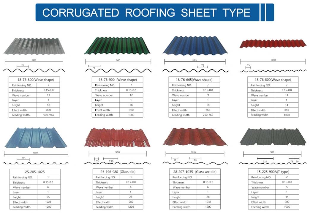 Tamaño popular | Materia prima 762mm a 680,670,660,655,650 mm. (después de corrugado) y 9 ondas; (después de corrugado) y 11 ondas; (después de corrugado) y 12 o 14 ondas |