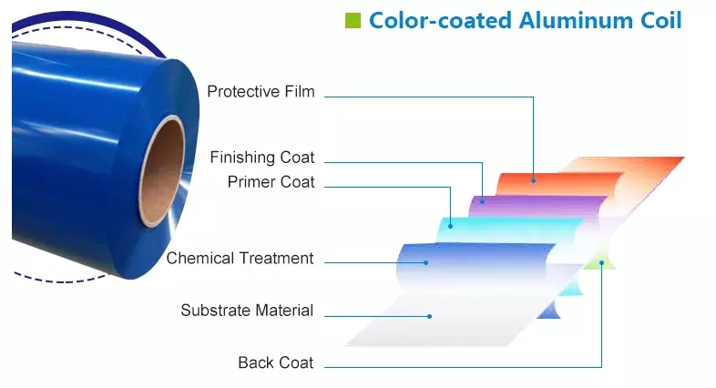 La lámina de aluminio recubierta de color PPAL / color se produce en una amplia gama de propiedades mecánicas y espectro de acabado incluye recubrimientos exteriores de alta durabilidad, resina epoxi, poliésteres, fluorocarbonos y metálicos. Los colores se pueden seleccionar de RAL. La mayoría de los recubrimientos están disponibles en uno o ambos lados, y pintados con 2 o 3 capas.