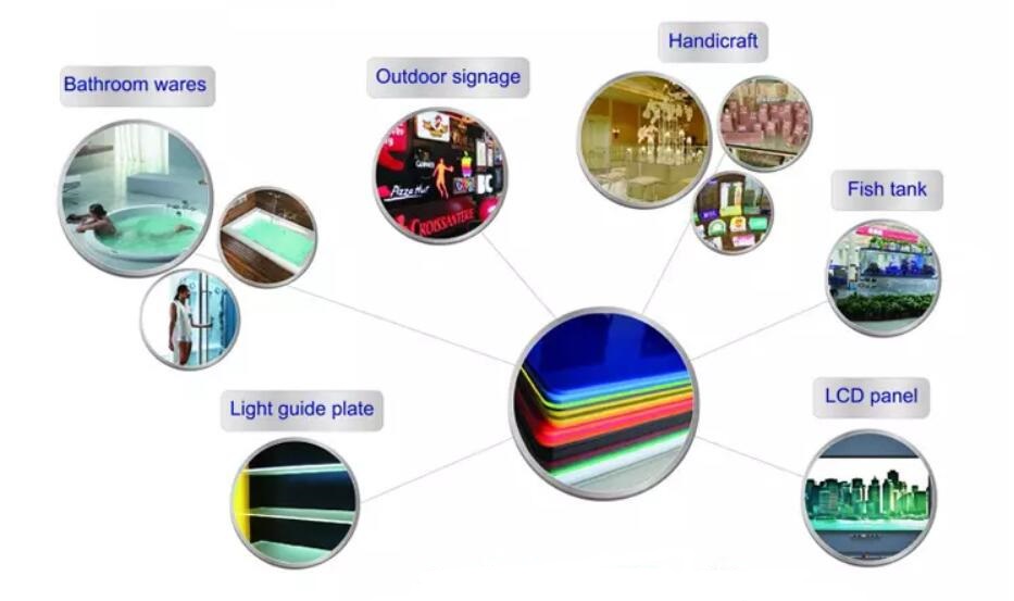 2. La hoja de acrílico se usa ampliamente para grabar, hojas de publicidad, lámpara-chimenea, decoraciones, electrodomésticos, obra de artes.