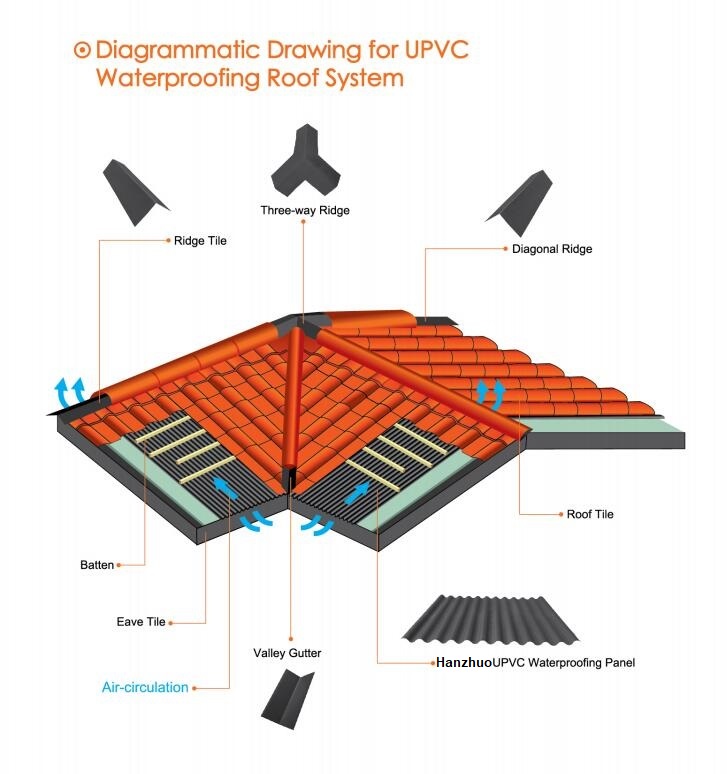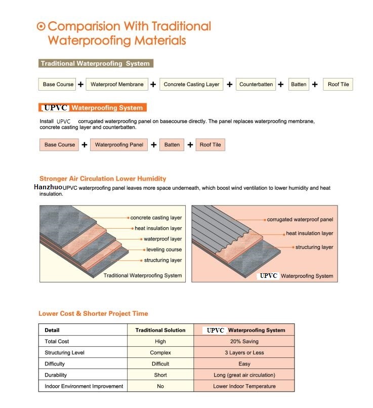 El panel de impermeabilización de UPVC es un nuevo tipo de material de techo, que proporciona circulación aérea y ventilación superiores. Sustituye la capa impermeable, la capa de concreto y el listón de contador de techo inclinado, de modo que el límite de tiempo del proyecto se acorta y el costo total es más bajo.